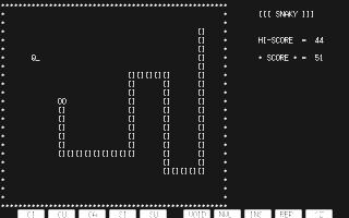 昔懐かしい、ヘビがネズミを食べて体を伸ばしていくゲームです。一般的になんという名前で呼ばれているのか知らないので、とりあえず『SNAKY』と呼んでおくことにします。 ルールは簡単。ヘビを上下左右にうまく操って、壁にも自分の体にも衝突しないように、なるべく沢山のネズミを食べるというゲームです。 どこにでも転がっているような代物かと思いますが、良かったらディスクの片隅にでも置いておいて、たまに遊んでやってください。