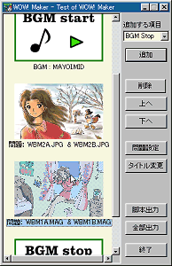 対応画像データは16色MAGとフルカラーJPEG、およびBMP。操作はほとんどマウスだけで行えます。作成したゲームデータは、著作権等に問題がなければ自由に配布することが出来ますし、配布条件に問題がなければWOW!プログラム本体と一緒に配布することも出来ます(WOW!本体の配布条件に関しては、添付の説明書を参照してください)。